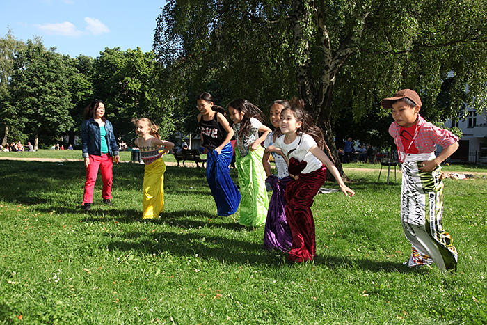 verschiedenen Spielen und Wettkämpfen, z.B. beim Sackhüpfen, mitmachen und dabei