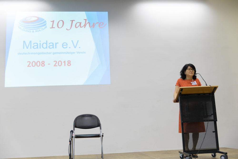 Khishigdulam Krause dankte allen Maidar-Mitgliedern und deren Familien, welche Verständnis für die Arbeit aufbrächten. Sie sagte: „Unsere Mitglieder agieren normalerweise im Hintergrund, wenn sie Veranstaltungen organisieren. Heute sollen sie im Mittelpunkt stehen“. Alle Mitglieder traten daraufhin auf die Bühne und sangen gemeinsam ein Lied. Im Anschluss wurden viele Gäste nacheinander auf die Bühne gebeten. Der Maidar Verein bedankte sich bei Ihnen für die Zusammenarbeit und bisher geleistete Unterstützung mit kleinen Geschenken. Daraufhin gratulierten die Gäste und überreichten ihrerseits Geschenke oder sogar Medaillen an die Maidar-Aktiven. Enkhtuya Sandan, selbst Maidar-Mitglied, übermittelte eine Grußbotschaft vom mongolischen Frauenverband aus Ulaanbaatar und übergab eine große Medaille.