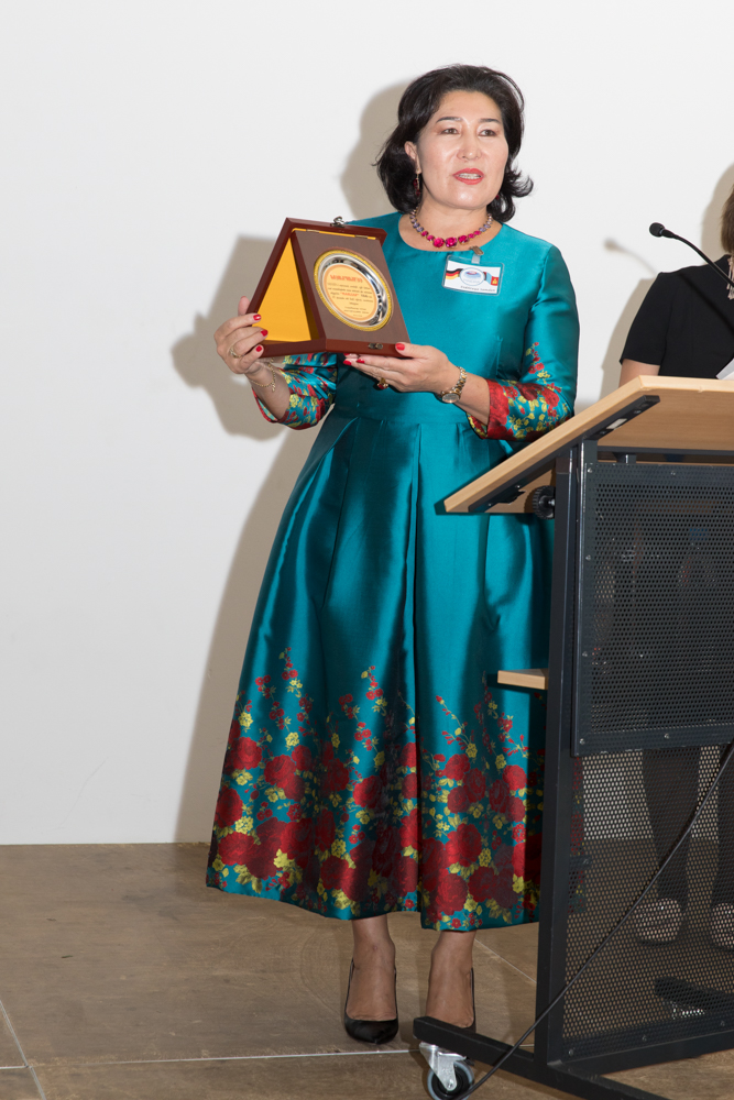 Enkhtuya Sandan mit der Medaille vom mongolischen Frauenverband