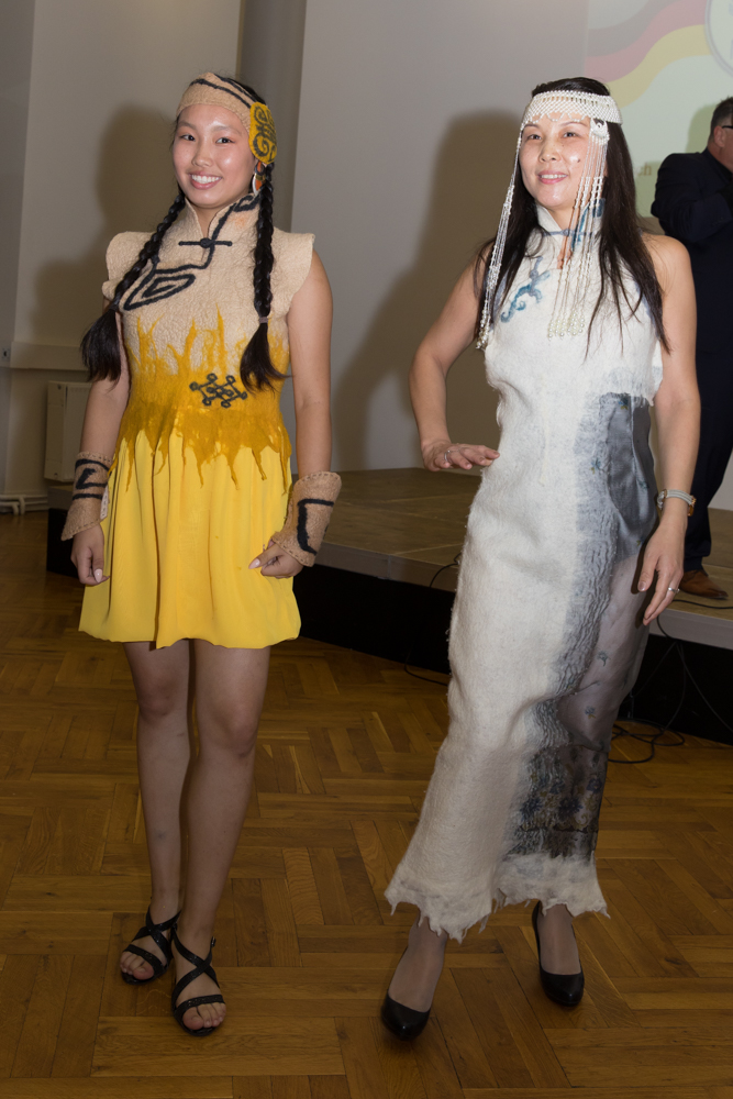 An den Wänden des Festsaals waren die Werke der Ausstellung „Metamorphose“ zu sehen, die in einem gemeinsamen Projekt mit den „Nomad Citizens“ entstanden waren. Mongolische Kunststudierende hatten sich in Workshops mit Fragen der Verantwortung in der Gesellschaft auseinandergesetzt.