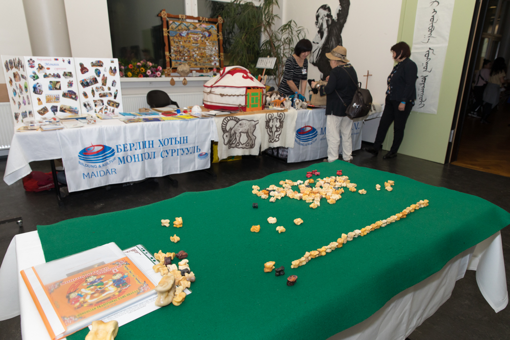 Die Arbeit von Maidar wurde auf Schautafeln mit Fotos und Berichten aus dem Vereinsleben, mit Zeichnungen und Gedichten der Schüler/innen als auch mit Filzprodukten an einem Stand dargestellt. Daneben gab es auch einen Tisch mit Schafsknöchelchen, an dem Shagai – das mongolische Knöchelspiel – ausprobiert werden konnte. Auch das bringen die Vereinsmitglieder den Kindern bei.