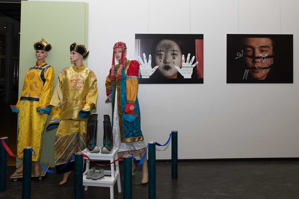 Ausstellung traditioneller mongolischer Kleidung und Bilder aus der Serie