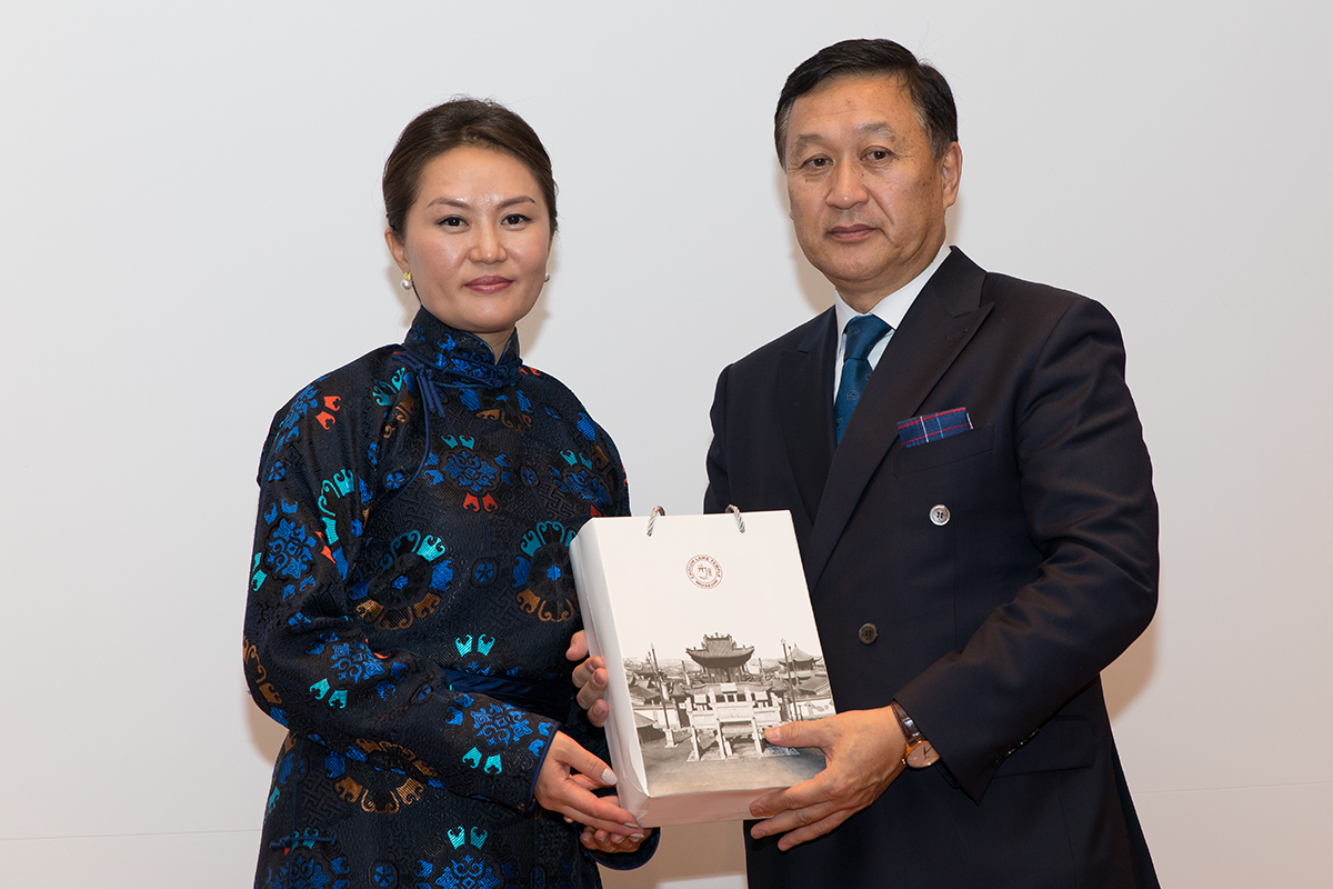 überreicht ein Präsent an Dr. phil. Ganbat Damba (Botschafter der Mongolei)