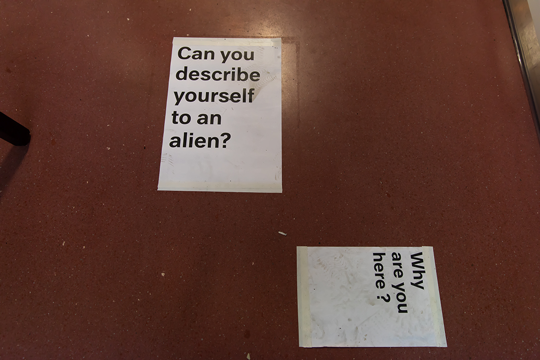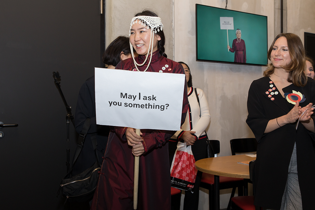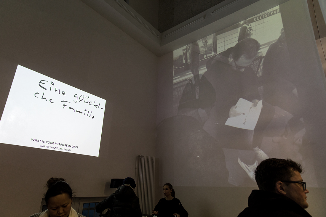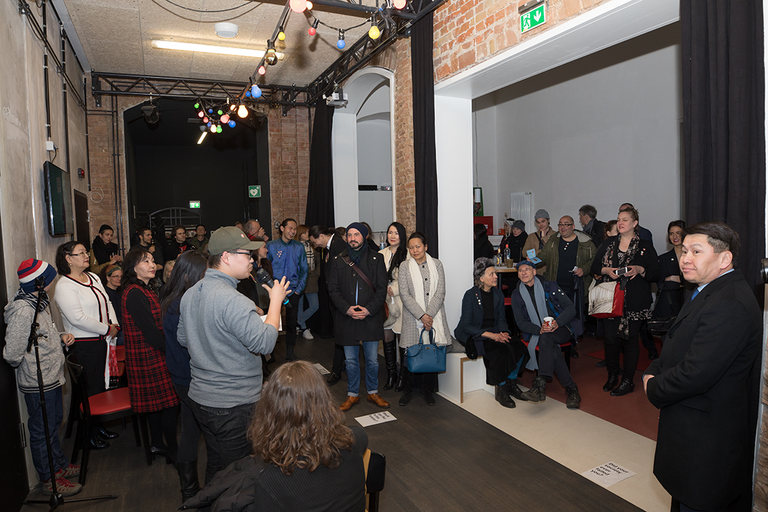 Im Vorraum des Theatersaals wurden visuelle und interaktive Projekte von Studierenden der MSUAC und derSRH Hochschule der populären Künste (hdpk) präsentiert. An die Wände waren Filme und Bilder projiziert. Auf dem Fußboden lagen Zettel mit Fragen an die BesucherInnen: „Warum bist du hier?“ oder „Bist du gelangweilt?“. Eine junge Mongolin im Deel und traditionellem Kopfschmuck hatte sich auf Berliner Straßen mit dem Schild „Kann ich dich etwas fragen?“ gestellt. Ihre Interventionen aus dem Stadtraum waren auf Bildschirmen zu betrachten.