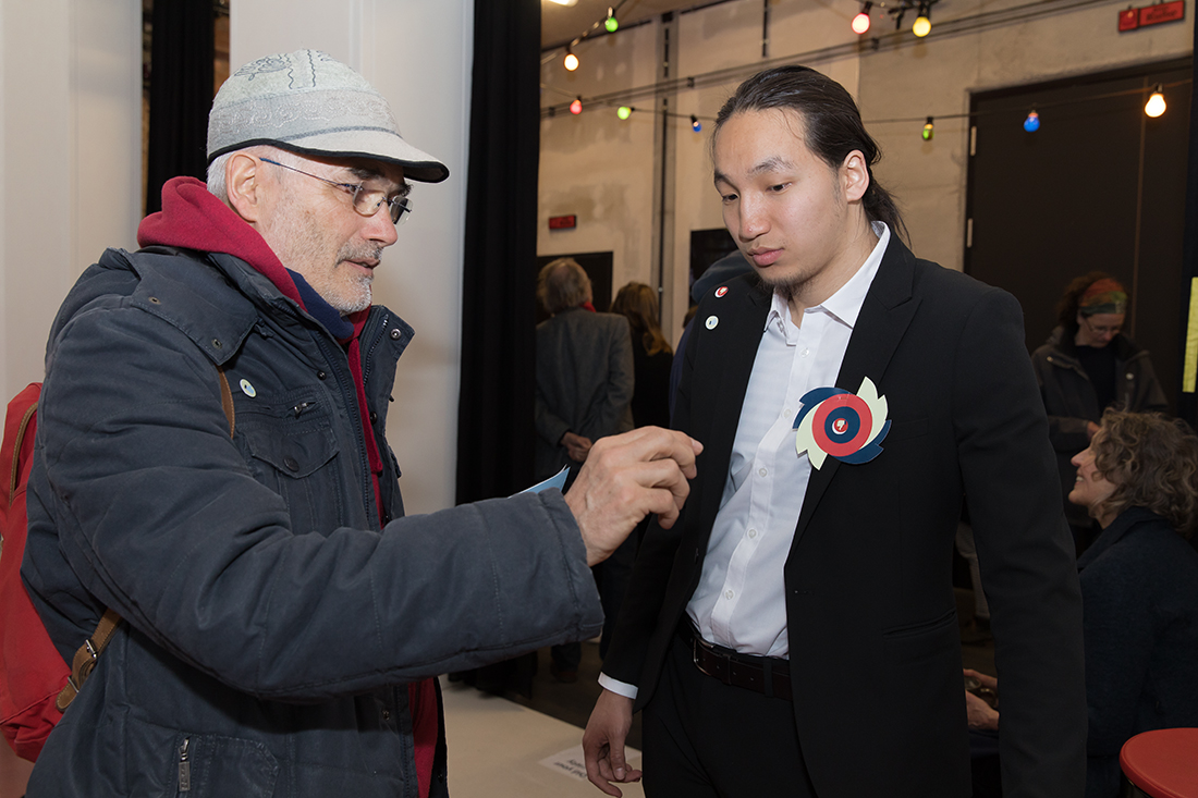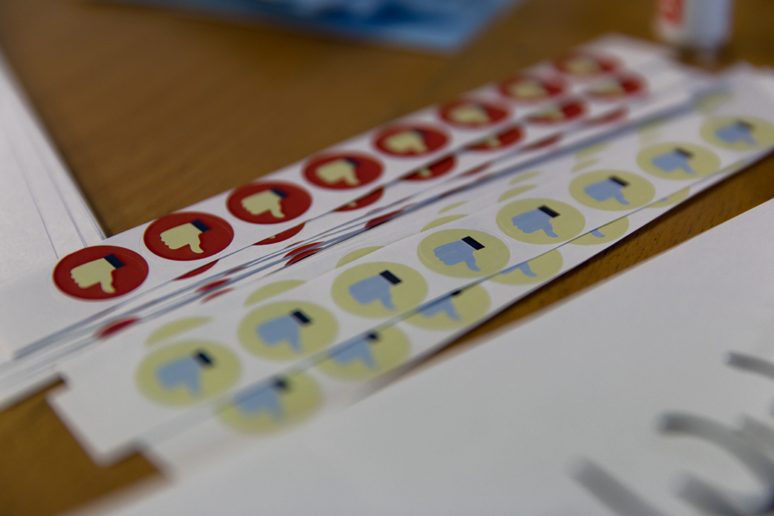 Ein weiteres Projekt bezog sich auf das soziale Punktesystem, das nach und nach in China eingeführt wird. BesucherInnen konnten Andere bewerten, indem sie Daumen-hoch- oder Daumen-runter-Klebepunkte an der Kleidung der jeweiligen Person anbrachten. Je schlechter die Bewertung, desto mehr Restriktionen wurden laut der Anleitung des Experiments angedroht.
