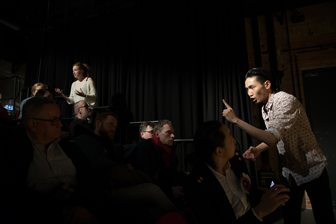 Während der Aufführung wechseln die Schauspielenden zwischen Englisch, Mongolisch und Deutsch hin und her. Eingeblendete Übertitel helfen. Dieses Fallen in eine andere Sprache, manchmal zwischen den Sätzen, verleiht der Vorstellung einen speziellen Reiz und wahrt die gewollte Distanz zur Handlung.