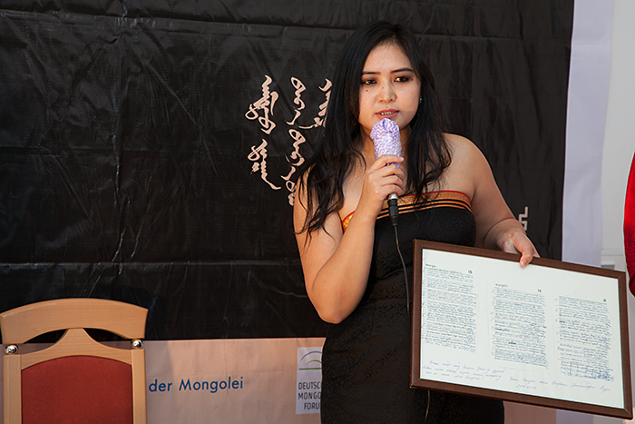 Erstaunlicherweise war auch die erste Deutschlehrerin von Solongo, Frau Naranchimeg, angereist. Sie war natürlich sehr stolz auf ihre ehemalige Schülerin und kaufte zur Unterstützung der Aktion gleich 20 Exemplare der CD. Auch die frühere Dozentin für deutsche Sprache der Otgontenger Universität Ulaanbaatar, Frau B. Tumennasan, kam auf die Bühne. Sie unterstrich die Bedeutung eines Netzwerks für das Gelingen eines solchen Projekts mit einem mongolischen Sprichwort: „Wer viele Freunde hat, ist so groß wie die mongolische Steppe. Wer keine Freunde hat, ist so groß wie eine Handfläche“.