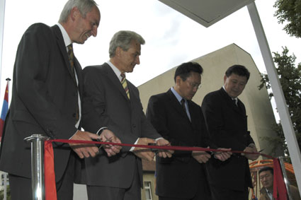 gemeinsam das rote Band vorm Eingang durchschnitten.