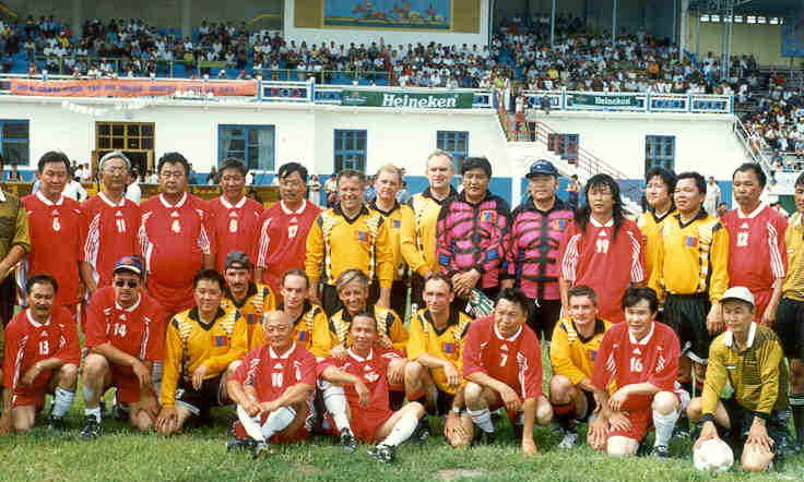 Ihr Gegner waren Prominente und Altrepräsentative des Gastgeberlandes, die eine volle Reservebank aufzuweisen hatten. Noch-Regierungschef und Verbandspräsident Amarjargal sowie sein Verbandssekretär Ganbold hatten nach dem Einmarsch der sieben Klubs und dem Hissen der FIFA-Flagge noch Reden halten müssen, dann aber flugs den Anzug mit der Fußballerkluft vertauscht. Erwähnenswert auch der Vizechef der Verkehrspolizei, Pionier, etliche gerade abgewählte und neu berufene Parlamentarier, drei Firmendirektoren und schließlich ein Sänger und ein Musikus der Erel-Hurd-Band.