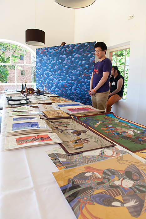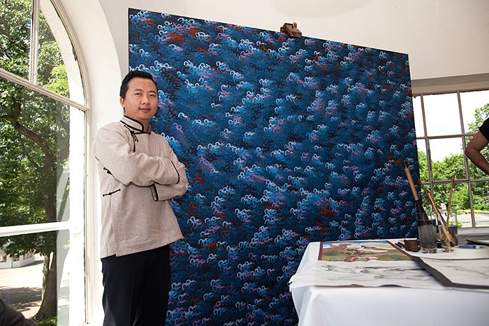 Otgonbayar Ershuu vor seinem Bild für die Botschaft