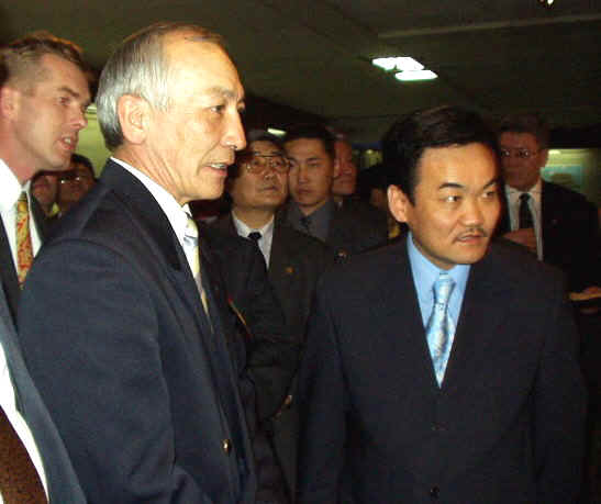 Natsagiin Bagabandi, in der Öffentlichkeit eher steif und in sich gekehrt wirkend, zeigte sich locker wie selten, als er sich von den Ausstellungsorganisatoren die Exponate erklären ließ.