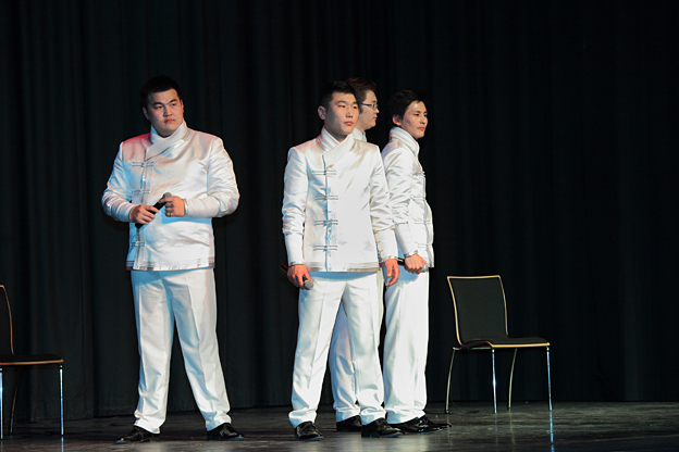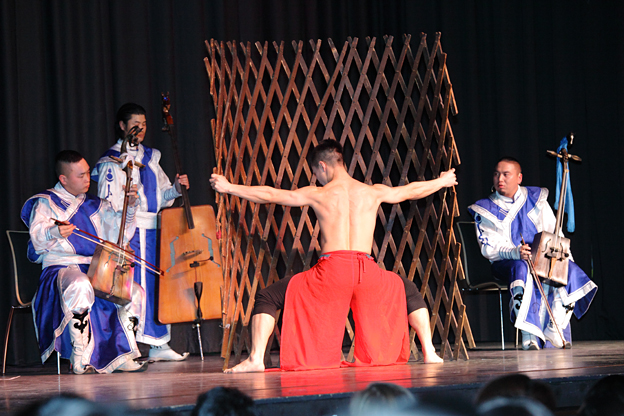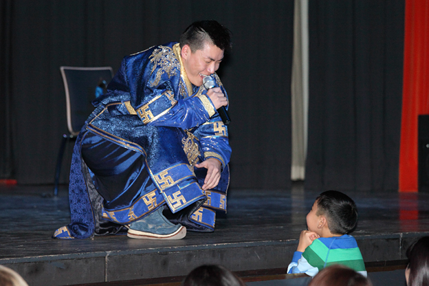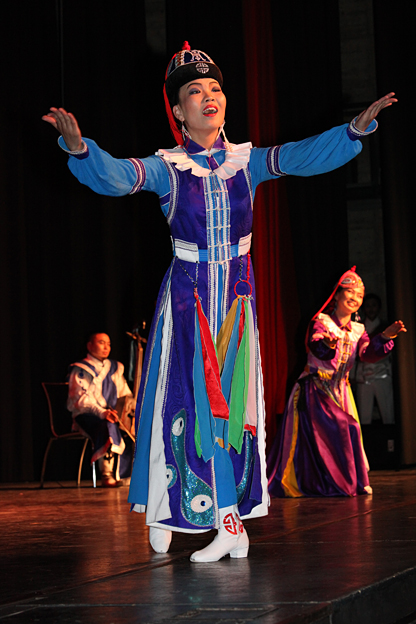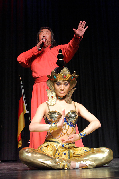 Das Programm begann mit der Sängerin des mongolischen Urtin Duu (langes Lied), E. Bolormaa. Es folgten traditionelle Tänze und ein Auftritt einer mongolischen Kontorsionistin (Schlangenmensch). Immer wieder gab das Publikum viel Beifall. Doch der Abend hielt noch mehr parat. Ein junger Mann im ausladenden, blauen Deel und einer Frisur, mit der er an die Leningrad Cowboys erinnerte, betrat die Bühne und wurde stürmisch begrüßt: der Popsänger Bold. Mit einem Lied über Mutter und Vater rührte er die Herzen. Authentisch kniete er sich zu den Kindern am Bühnenrand hinab.