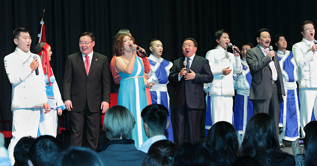 Während seines Aufenthalts in der Bundesrepublik Deutschland lud der Präsident der Mongolei, Tsakhiagiin Elbegdorj, seine in Deutschland lebenden Landsleute zu einem Konzert ein. Am Abend des 31. März 2012 füllte sich der große Saal der Berliner Urania mit Mongolinnen und Mongolen so sehr, dass für viele nur noch ein Stehplatz am Rande zur Verfügung stand. Zu Beginn erklang die mongolische Nationalhymne, die alle mitsangen. Einige junge Männer legten dabei ihre Hand aufs Herz.