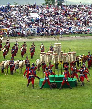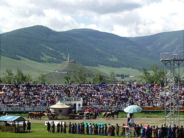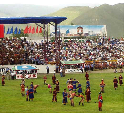 Am 11. Juli, Punkt 11.00 Uhr, hat Präsident Natsagiin Bagabandi, gekleidet in einen beigefarbenen Seidendeel, die Feierlichkeiten im Zentralstadion von Ulaanbaatar eröffnet, das an diesem Tag traditionsgemäß bis auf den letzten Platz gefüllt ist: Stadtbewohner und Viehhalter, Diplomaten, Touristen und selbstverständlich die gesamte mongolische Staatsführung versammeln sich, um Sportler, Künstler und Soldaten vorbeidefilieren zu sehen, den Pferdegeigenspielern zu lauschen und das Aufpflanzen der neun weißen Ehrenstandarten zu beobachten.