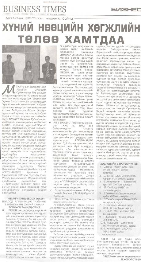 Die Marktforschungs- und Trainingsabteilung der MNCCI hat im letzen Jahr ein vierwöchiges Intensivtraining zum Thema „Personalmanagement“ für mehr als 40 Personalmanager von Mitgliedsunternehmen erfolgreiche durchgeführt. Auf der Basis der Interessen und Lernbedürfnisse dieser Teilnehmer wurde - im Rahmen des Kammerpartnerschaftsprojektes der SEQUA und der MNCCI - ein vertiefender Personalmanagement- und Personalentwicklungsworkshop durchgeführt. An diesem Training nahmen rund 20 Teilnehmer teil und haben während des viertägigen Workshops Probleme der modernen Personalentwicklung diskutiert und aktuelle Probleme im Personalbereich zwischen Deutschland und der Mongolei vergleichen sowie Mitarbeitermotivations-, -bewertungs-, führungs- und Change Management Tools kennen gelernt. Dieses Training wurde von einem Trainerteam - Gerelchimeg Ch.-Trede und Thorsten Trede der International Management & Marketing Academy der APPLICATIO Training & Management GmbH, Hamburg mit modernen Lehrmethoden in sehr interessanter Art und Weise durchgeführt.