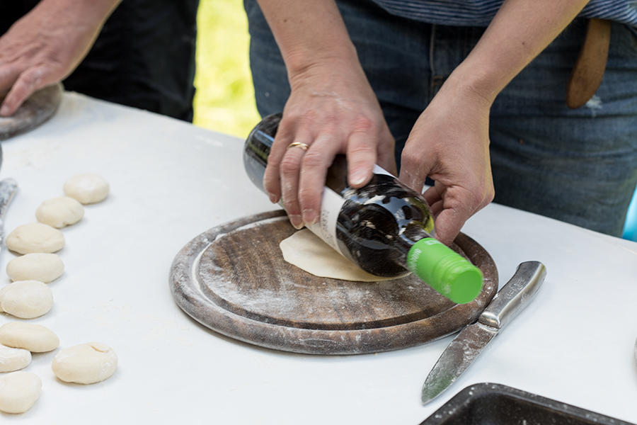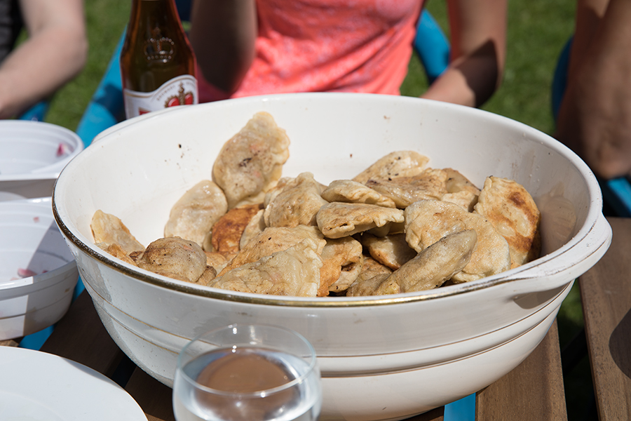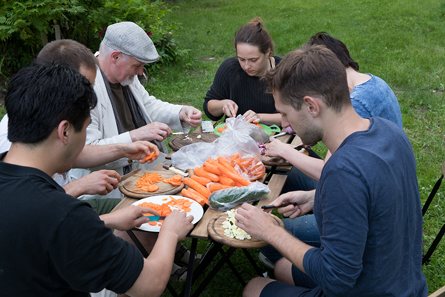 Einen großen Teil der Workshoptage nahm die Herstellung des mongolischen Naadam-Gerichts Chuuschuur ein. Große Mengen an Fleisch und Gemüse (für die Vegetarier_innen) wurden gemeinsam verarbeitet, in Teigtaschen gefüllt und in Öl gebraten. Die vielen Schüsseln voller Chuuschuurs wurden an der langen Tafel danach ziemlich schnell leer.
