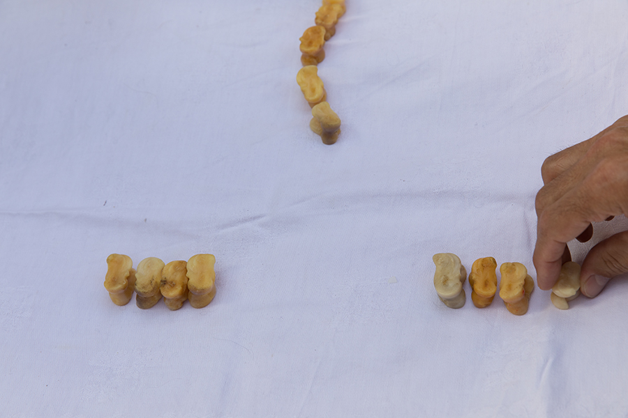 Die Workshop-Teilnehmenden lernten Spiele mit Shagai, den Schafsknöchelchen, kennen. Sie spielten und würfelten „Pferderennen“ und schnipsten das verbreitete Shagai. Mit den Knöchelchen lässt sich eine große Vielfalt unterschiedlichster Spiele ausüben.