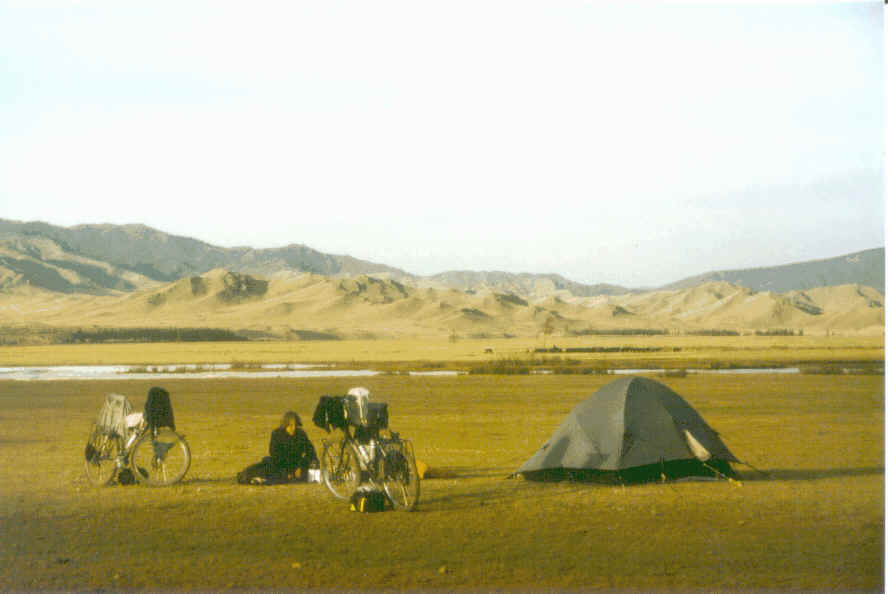 Bei Temperaturen tagsüber um den Gefrierpunkt und nachts deutlich darunter fahren wir, natürlich bei kräftigem Gegenwind, nach Westen. Diese Strecke ist mehrheitlich geprägt von weiten Steppen, welche nur gelegentlich von Hügeln unterbrochen werden, und zu unserer Überraschung auch von vielen sandigen Gebieten, die vor allem in der zweiten Hälfte dieser Etappe liegen. Die Landschaft präsentiert sich der Jahreszeit gemäss sehr trocken, dürr und gelbbraun. Stellenweise wüten grosse Wald- und Steppenbrände, die meist absichtlich entfacht werden, um Geweihe von Wild zu finden. Auch der starke, zum Teil stürmische Westwind ist für die Mongolei und besonders für den Frühling nichts aussergewöhnliches und sorgt dafür, dass wir unser Zelt am Morgen immer frei von Kondenswasser verpacken können. Täglich erleben wir bei viel Sonne schöne Wolkenspektakel, die über den Himmel ziehen. Gelegentlich fegen Sandstürme über die Ebenen. Bekanntschaft mit Regen machen wir bis Mitte Juli nur ein einziges Mal, so dass uns die meist brückenlosen Flüsse keine allzugrossen Probleme bereiten. Die Wege und Pisten sind hier mehrheitlich erdig und gut befahrbar, manchmal waschbrettartig gerillt, so dass wir auf unseren ungefederten Velos geschüttelt und durchgerüttelt werden. In den sandigen Abschnitten bleibt uns nichts anderes übrig, als unsere schwer bepackten Velos zu schieben. Steine sind hier noch selten. Die Steppen sind voller Herden mit unzähligen Jungtieren. Für viele schwächere Pferde, Kamele und Schafe bedeutet der karge Frühling jedoch den Tod. Sie liegen verwesend auf der Steppe und werden von den aasfressenden Vögeln verspiesen. Jede Tierleiche wird vom Wind (aufgrund des Verwesungsgestanks) lange im voraus angekündigt. Wir freuen uns über die ersten Blumen und Gräser, welche die Steppe zu beleben beginnen. Wie bei uns zu Hause wird der Frühling von vielen Vögeln und ihren zwitschernden Gesängen begleitet.