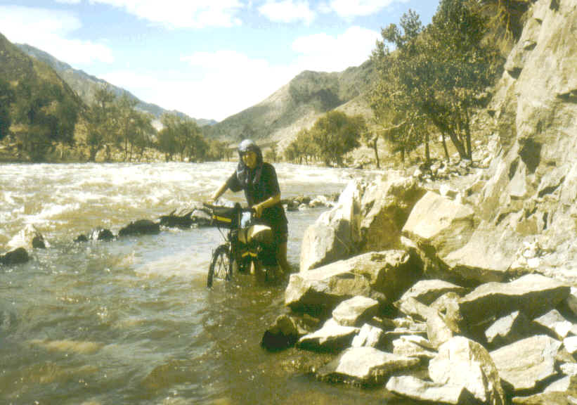 Die zweite Etappe ist geprägt vom steilen Altay-Gebirge. Die Wege, Pisten und Spuren, denen wir folgen, sind oft steinig oder sandig und schwierig befahrbar. Speziell die scharfkantigen Steine setzen unseren Reifen arg zu, und die im Sand versteckten stacheligen Samen lassen unseren reichlichen Vorrat an Flicken bedrohlich schrumpfen. Um den Zeltboden vor den Stacheln zu schützen, legen wir unsere Liegemätteli unter das Zelt, direkt auf den Sand. Harte Aufstiege zehren an unseren Kräften, doch werden wir immer wieder mit schönen, eindrücklichen Aussichten belohnt. Schnelle Abfahrten sind wegen der steinigen Wege selten möglich. Gegen- und Rückenwind wechseln sich von der sechsten Woche an ziemlich gleichmässig ab, da wir nun hauptsächlich südwärts fahren, und das Gebirge den Wind deutlich abbremst. Vor allem im letzten Abschnitt dieser Etappe haben wir einige Flüsse zu queren und waten manchmal in der Fliessrichtung des Flusses auf einem knietief überspühltem Weg.