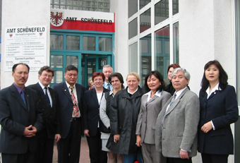 Amtsdirektor Dr. Haase empfing gemeinsam mit den Amtsleitern die Delegation am 10. März 2002 in seinen Amtsräumen. Gesprächsthema waren die Situation des Amtes nach dem Beschluss zur Gemeindegebietsreform im Landtag, die Entwicklung der Region, die weitgehend von den Entscheidungen zum Flughafenbau abhängt und Fragen des Verwaltungsablaufs im Amt selbst. Bürgermeister Zorigt umriß die Aufgaben, die auf ihn im Jahr 2003, das zum Jahr der Initiativen und Effizienz erklärt worden war, zukommt. Er unterstrich das Interesse der Delegation zu Liegenschaftsfragen. Am 1. Januar sei in der Mongolei das Gesetz über die Bodenreform in Kraft getreten, das die Privatisierung von Grund und Boden beinhaltet, was völlig neue Aufgaben für die Verwaltung mit sich bringe, erklärte der Bürgermeister. Das erklärte auch das Interesse der Gäste an der Arbeit des Bauamtes. Auch den Besuch im Landratsamt nutzten die mongolischen Gäste, um im Katasteramt von den Erfahrungen ihrer deutschen Kollegen zu lernen. Landrat Wille bot der Delegation einen herzlichen Empfang und die stellvertretende Amtsleiterin Frau Killiches stand zum ausführlichen Gespräch bereit. Das umfangreiche Besuchsprogramm beinhaltete ausserdem einen Besuch in der Gemeinde Großziethen, bei dem Bügermeister Lehnen und die Leiterin der Kita „Sonnenblick", Frau Langer, Auskunft zur Entwicklung der Gemeinde gaben. Auch ein Besuch der Klee-Oberschule in Neukölln und ein Treffen im Bundesministerium für Wirtschaft und Arbeit standen auf der Tagesordnung. Besonders wichtig war beiden Seiten die Pflege der persönlichen Kontakte, die die Grundlage einer fruchtbaren Zusammenarbeit bilden. Am Ankunftsabend wurde beim gemeinsamen Abendessen im Hotel Belger ein Mongoleizimmer eingeweiht, an dessen Wänden die Fotos der Reise nach Ulaanbaatar aus dem letzten Jahr zu sehen sind. Auch beim gemütlichen Beisammensein, zu dem Karl Mette eingeladen hatte, gab es Gelegenheit, Erinnerungen an die Besuche wach werden zu lassen. Am 16. März 2003 flogen die mongolischen Besucher zurück in ihre Heimatstadt in dem Bewußtsein, dass es nicht der letzte Besuch war.