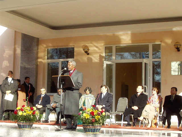 Am Morgen des 17. Oktober hat Kofi Annan an der Einweihungszeremonie für die neue UNO-Residenz im Gebäude der ehemaligen nordkoreanischen Botschaft teilgenommen und das wunderbar zum blauen mongolischen Himmel passende UNO-Emblem enthüllt. Zu den Gästen der Veranstaltung gehörten neben Vertretern des diplomatischen Corps, Ministerpräsident Enkhbayar, Außenminister Erdenechuluun, die Repräsentanten der UNO und der Weltbank in der Mongolei, S. Menon und S. Meynathan.
