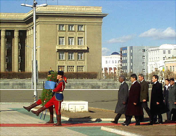 China, die Mongolei, Kasachstan, Usbekistan, Kirgisien und Tadschikistan heißen die Stationen der ersten Zentralasienreise des UNO-Generalsekretärs Kofi Annan vom 13. bis 23. Oktober. Am 16. und 17. stand die Mongolei auf dem Programm des höchsten Repräsentanten der Weltfriedensorganisation. Hier traf er mit Präsident N. Bagabandi, dem stellvertretenden Parlamentsvorsitzenden J. Byambadorj und Ministerpräsident N. Enkhbayar zusammen.