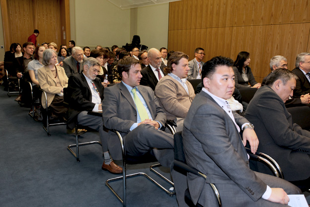 Herr B. Ganzorig, Leiter der Agentur für ausländische Investitionen und Außenhandel der Mongolei, sprach in seinem Vortrag über die rechtlichen Rahmenbedingungen für ausländische Investoren und über die aktuelle Lage der mongolischen Wirtschaft. Er stellte die wichtigsten Rohstofflagerstätten vor.