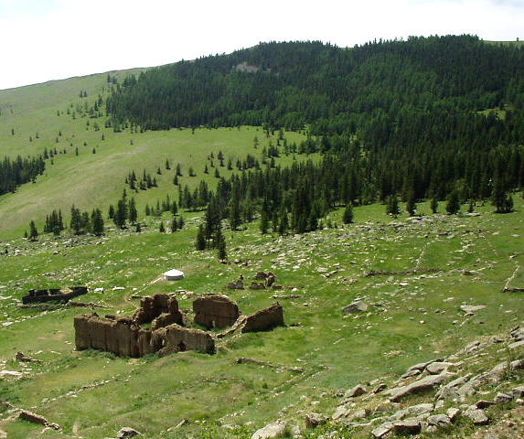 Klosterruine Manzushir in einem Tal des Bogd-Uul