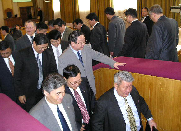 Die drei anwesenden Oppositionsabgeordneten, L. Gundalai, B. Erdenebat und J.