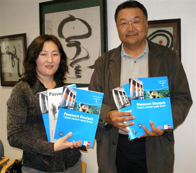 Mit dem neuen Deutschlehrbuch. V. l. Ts. Nyamkhishig, B. Bayarsaikhan