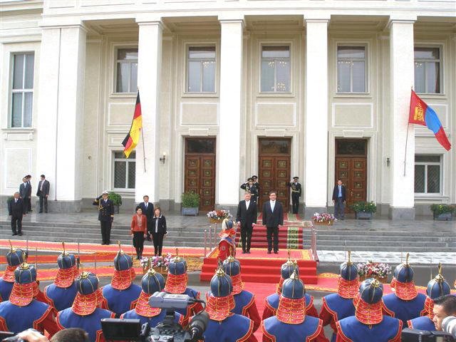 Bundespräsident Köhler und Präsident Enkhbayar vor dem Regierungspalast in