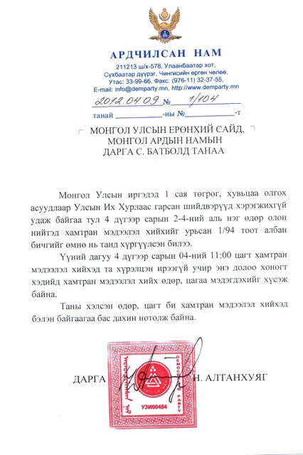 Der Vorsitzende der DP N. Altankhuyag hat ein zweites Schreiben an