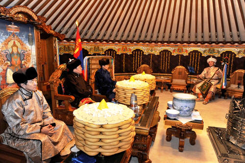 Danach spielte Ts. Tserendorj, der einzige Künstler mit dem Recht, die „Kaiserpferdekopfgeige" zu spielen, die Willkommensode für das neue Jahr. Dabei zugegen waren die Oberlamas der Klöster Gandantegchilen und Dashchoilon D. Choijamts und Ch. Dambajav.