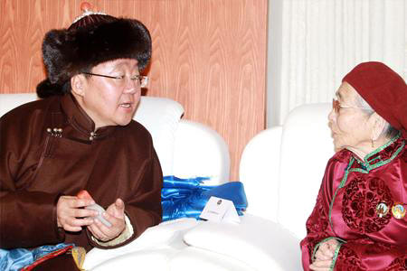 Präsident Ts. Elbegdorj im Gespräch mit einer Seniorin. 22.02.2012 Foto