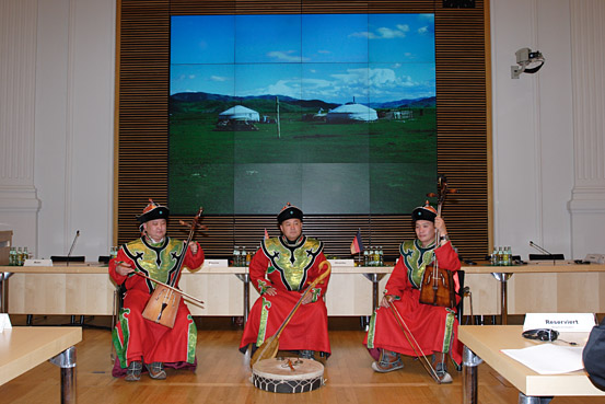 Ein Ensemble stimmt mit klassischer mongolischer Musik den Wirtschaftstag ein.