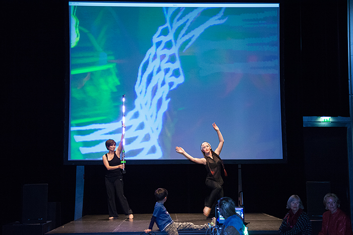 Doch der erste Abend hatte noch mehr zu bieten. In einem anderen Saal führten Studierende mongolischer und deutscher Universitäten Performances auf. Sie ertanzten sich im Rahmen des Projekts „Green Lake – Nogoon Nuur“ den Raum zwischen den dort präsentierten Installationen und kombinierten ihren Tanz mit Licht-Graffitis, die auf einer Leinwand über der Bühne sichtbar wurden. Ein weiteres Highlight des Abends, das den Zeitgeist der mongolischen Hauptstadt Ulaan Baatar nach Berlin brachte, befand sich vor dem Gebäude des Radialsystems im dort aufgestellten Ger (Jurte). Zwei junge Musiker, Temujin und Temulin, luden die Gäste zur Karaoke mit mongolischer Popmusik ein. Anfangs zögerlich, aber mit der Zeit immer begeisterter nahmen immer mehr Neugierige dieses Angebot wahr, so dass es bald kaum noch Platz in der runden Filzbehausung gab. Die Playback-Lieder waren unterm Sternenhimmel weit über das Gelände zu hören.
