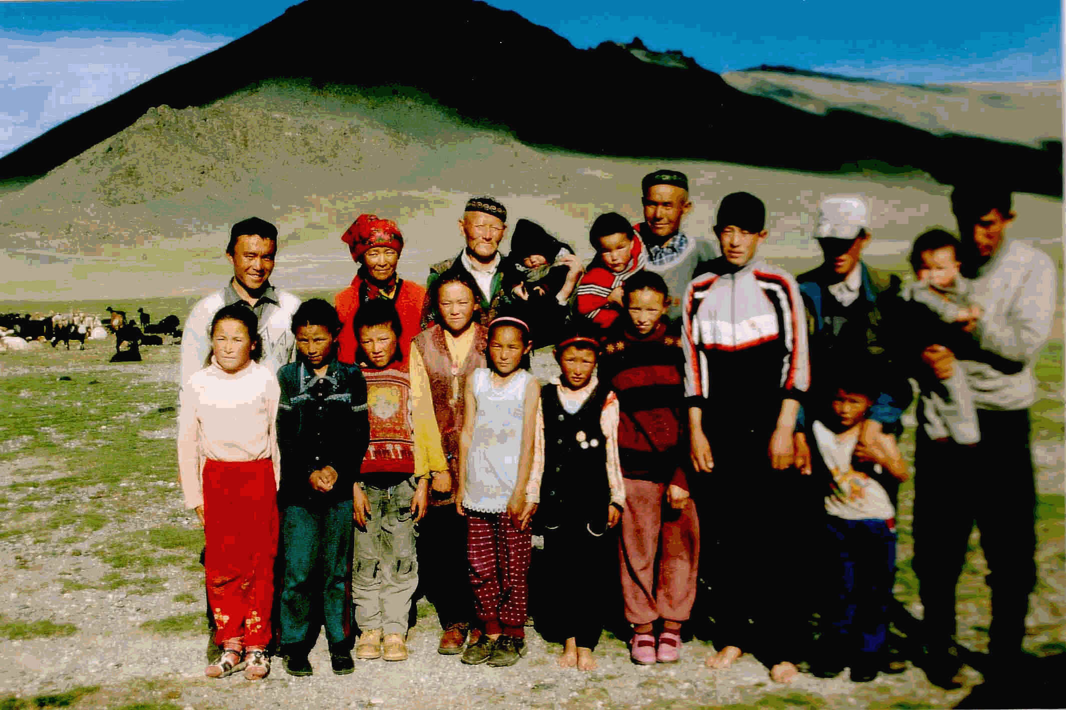 Es kommen immer mehr Familienmitglieder und zum Schluss ist fast die ganze Sippe beisammen. Wir hocken auf einem Teppich vor der Jurte und verkosten Airag, aus einer grossen Blechschüssel. Das älteste Familienmitglied ist ca. 90 Jahre alt und macht auf uns einen jungen und kecken Eindruck. Als wir fragen, wie das mit dem Heiraten ist, meint er nur, die Frauen kämen schon, wenn sie die Männer bräuchten.