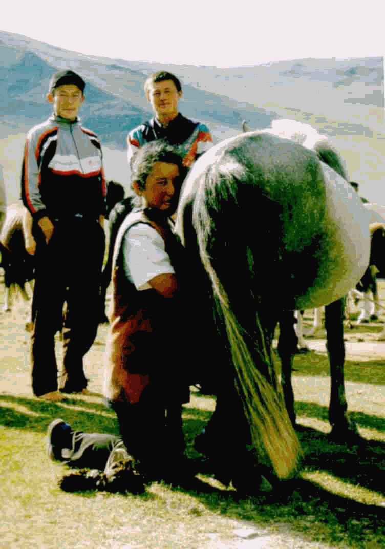 So gegen eins sind wir zurück und es gibt einen Imbiss. Der Pferdeguide kommt nicht, er sucht die Pferde. Reiten werden wir auf Wallachen. Stuten werden selten geritten. Sie werden gemolken, um aus der Pferdemilch Airag herzustellen.