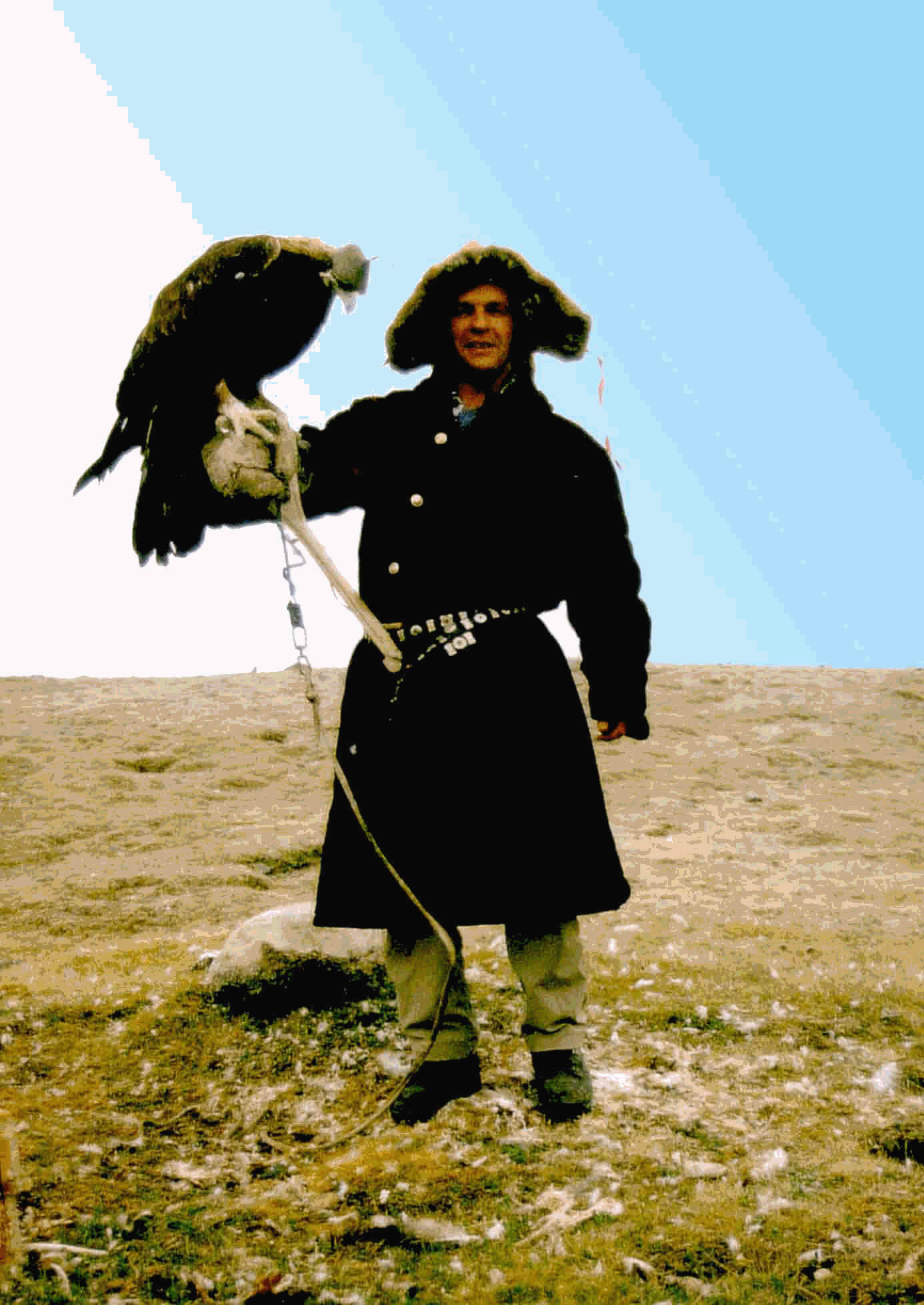 Es war eine kalte Nacht und ich habe besonders an die Füsse gefroren. Nach dem Frühstück fängt es an zu regnen. Wir fahren über einen Berg und kommen zu der Familie, welche zwei Adler hat. Die beiden grossen Vögel sitzen an einer Kette angebunden am Boden. Aber zuerst einmal gibt es Milchtee und Milchprodukte sowie in Öl gebackene Teigtaschen. Die Leute sind ungezwungen und freundlich. Roland soll den Adler halten. Er will nicht und so darf ich es zuerst probieren. Der Vogel bekommt eine Lederkappe aufgesetzt. Ich ziehe den Handschuh an und nehme den Adler. Er ist riesengross und ich schätze mindestens 10 kg schwer. Er schnauft, ihm ist die Sache wohl auch nicht ganz geheuer. Roland darf ihn dann auch mal halten, ich mache Fotos. Alle wollen sich brüsten mit dem stolzen Vogel. Zu guter Letzt muss noch ein Pferd her, es dauert ein paar Minuten bis der Adlerbesitzer mit dem Adler auf dem Arm aufsteigen kann. Das Pferd hat Angst. Schliesslich pariert das Pferd und wir fotografieren.