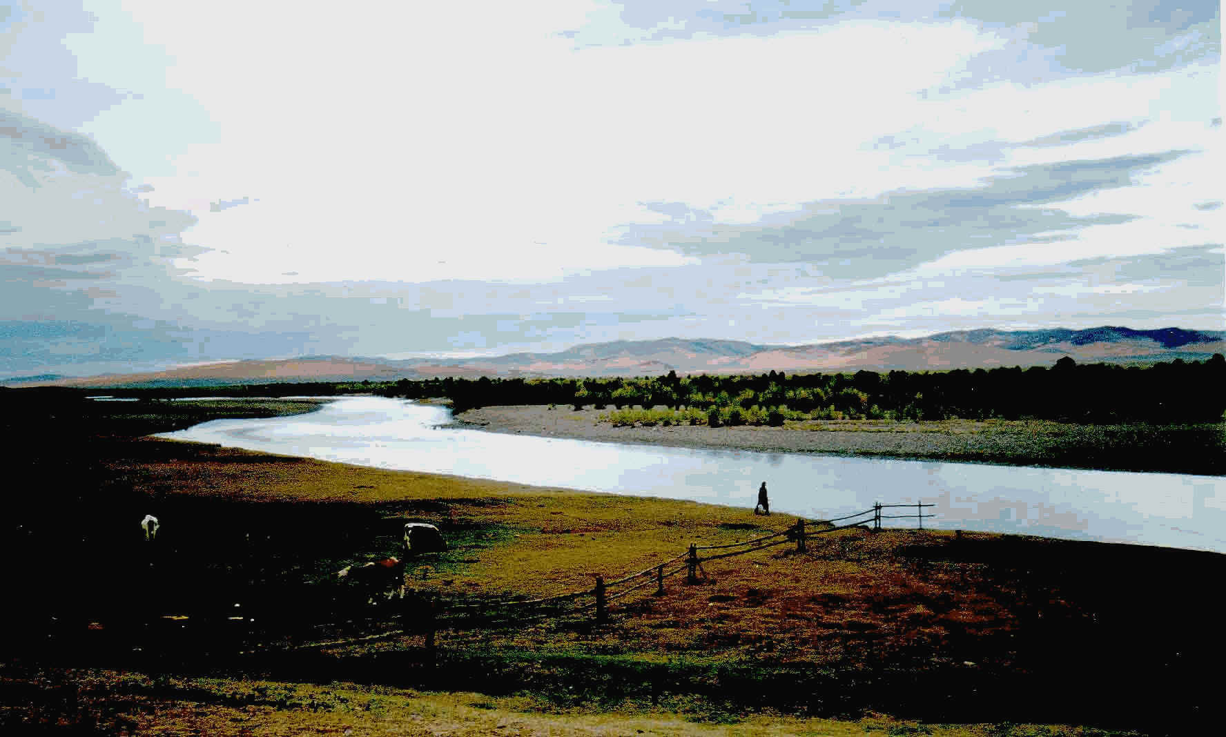Der Rückweg fällt uns schwer. Die Sonne brennt und die Pferde traben und traben, d.h. für uns stehen. Die Mongolen stehen mehr im Sattel als das sie sitzen. Kurz vor dem Dorf würde ich am liebsten absteigen und laufen, alles tut mir weh. Die Pferde überqueren den Fluss Cherlen, sie kennen den Weg.
