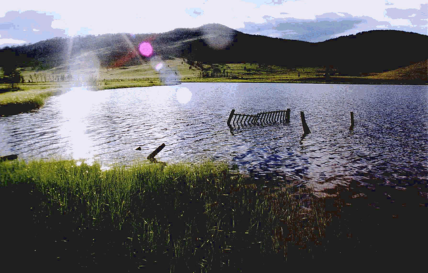Anfangs reiten wir etwas im Trab. Die Pferde wollen laufen. Wir überqueren einen Pass und ich umrunde mit dem Pferd 3x den Owoo – einen heiligen Steinhaufen. Weiter geht es im Schritt durch Wiesen, Wälder, Bäche, an verkohlten Berghängen vorbei bis zum See. Die Pferde tragen uns über alle Unebenheiten des Geländes. Gegen vier Uhr sind wir am See. Er ist gar nicht blau der See, sondern klein und grün, aber trotzdem schön.
