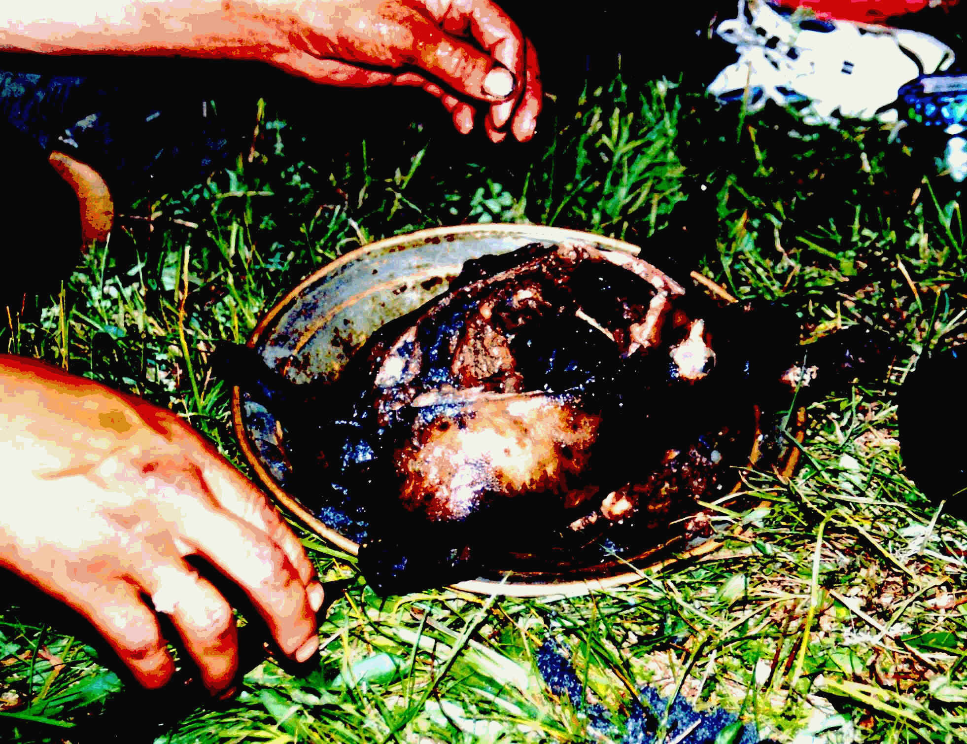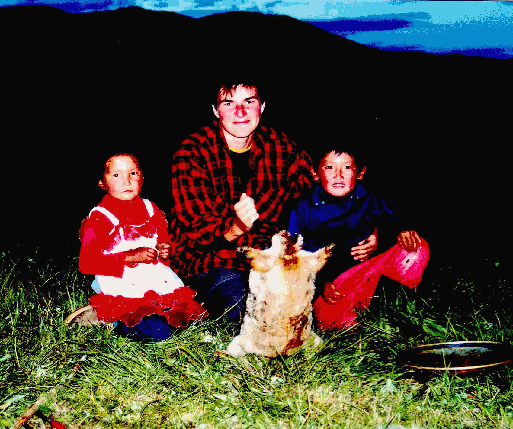 Gegen 9 Uhr kommt der Mann von der Jurte und bringt ein Murmeltier mit. Am Feuer werden dem Tier die Haare abgesenkt und der Festschmaus beginnt. Mittlerweile ist auch die Frau und die beiden Kinder da. Zuerst gibt es für jeden etwas Suppe und dann das Murmeltier. Das Fleisch schmeckt, aber es knirschelt zwischen den Zähne, da es mit heissen Steinen von innen gegart wurde. Die Mahlzeit ist etwas dürftig. Einen Topf Suppe und ein Murmeltier für neun Personen. Aber besser wie nichts gegessen.
