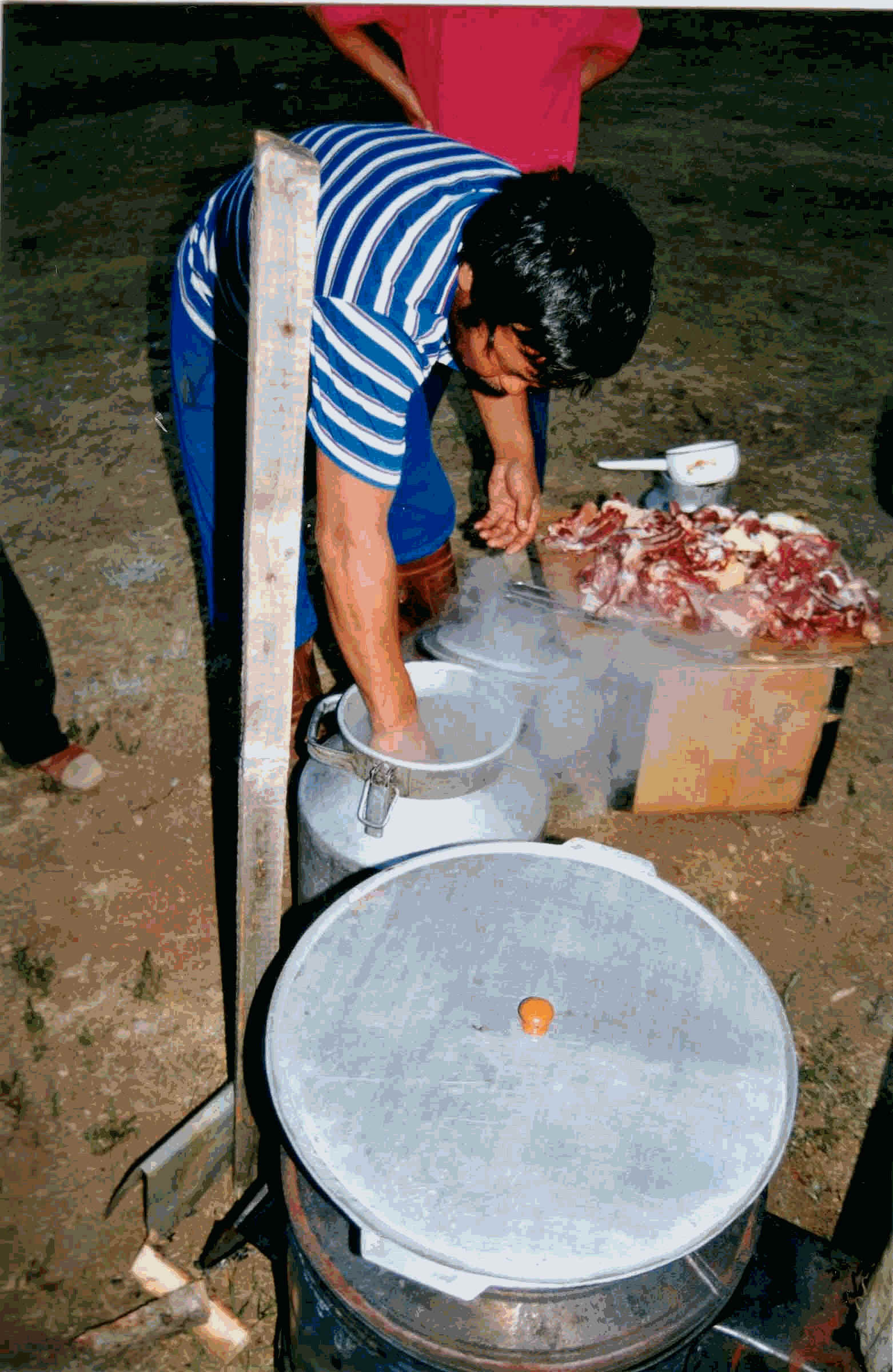 Heute feiern wir das Abschiedsfest. Dafür wird ein Schaf geschlachtet. Wir sind die Gastgeber und kaufen es von der alten Frau für 18 Dollar. Das Fleisch wird in der Milchkanne mit heissen Steinen gekocht. Gewürzt wird es mit Salz, wenig Pfeffer und ein paar Lorbeerblättern. Dann gart das Ganze eine dreiviertel Stunde auf dem Ofen. Vorher werden die Innereien gekocht und mit der Brühe wird Nudelsuppe gemacht. Das Fest beginnt ca. 21.30 Uhr. Wir bedanken uns bei allen für die gelungene Reittour. Roland teilt Wodka aus und ich die Geschenke. Dann beginnt das Essen. Zuerst gibt es Suppe, dann das Fleisch. Die Mongolen essen sehr schnell und im Nu sind sie fertig. Die Tische und Stühle werden beiseite gestellt und der Tanz wird eröffnet. Es ertönt mongolische Volksmusik, aber auch Diskomusik aus der Konserve.
