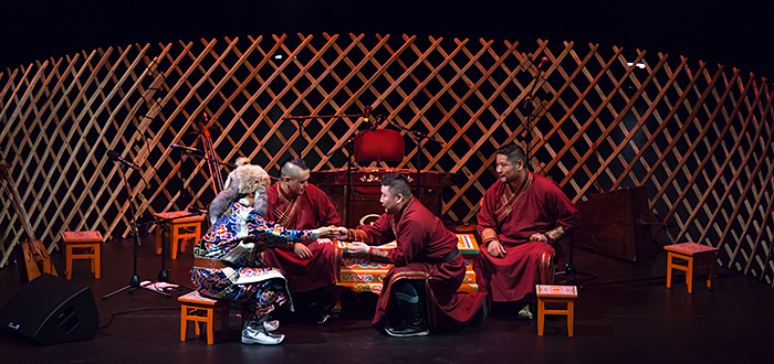 Das Konzert an diesem Abend trug den Titel „Dschingis Khans Jurte“. Auf der Bühne war ein Halbrund aus Scherengitterwänden, dem Grundgerüst des Gers (Jurte), aufgebaut. An einem traditionellen, farbenprächtigem Tisch nahmen die Musiker auf ihren Hockern Platz. Dieses Bühnenbild vermittelte einen kleinen Einblick in das Innere eines Gers.