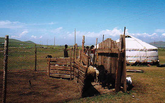 Unterwegs machten wir Stop bei einer Nomadenfamilie, die auf dem Weg zu einem Fest in die Stadt war. Sie waren genauso neugierig auf uns, wie wir auf sie und so bestaunten und beschnupperten wir uns. Leider war eine Unterhaltung fast unmöglich, den man hat in der Mongolei zwar kyrillischen Buchstaben, aber eine ganz andere Sprache. Es war aber unschwer zu erkennen, dass hier traditionelles und modernes Leben aufeinander prallten. Junge Mädchen in hellen Jeans trugen Plateauschuhe und T-Shirts und der Großvater daneben die typische Kleidung der Hirten. Wir sahen Jurten mit riesigen Satellitenschüsseln , während das Wasser auf einem Wägelchen in einer Tonne von weit her geholt werden musste. Das kleine Vieh (Ziegen, Schafe) und große (Kühe, Pferde und Kamele) ist der ganze Reichtum einer Nomadenfamilie und somit ihre Existenzgrundlage. Das bringt viel Arbeit mit sich, es müssen ständig neue Weideplätze gesucht werden und im Schnitt schlägt man die Jurte dreimal im Jahr ab, um weiter zu ziehen. Dafür braucht man viele fleißige Hände und so ist es auch nicht verwunderlich, dass eine Nomadenfamilie zwischen 10 und zwölf Kindern hat, während die „Städter" nur 2-4 Kinder haben. Noch vom letzen Winter waren mir die Berichte von der Eiseskälte, dem Zud, in der Mongolei in Erinnerung geblieben. Der Zud gehört zu den schlimmsten Naturkatastrophen und wird doch selten von der internationalen Presse wahrgenommen. Die Hälfte aller Viehbestände waren dem Zud zum Opfer gefallen und die Nomaden sind von Armut bedroht, ohne staatliche und internationale Unterstützung.