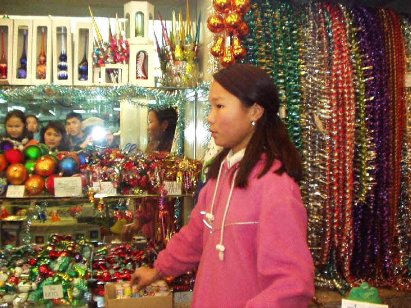 Unurtsetseg hilft ihrer Mutter, Neujahrsschmuck zu verkaufen