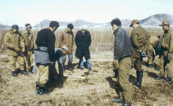 Mit diesen Geräten ausgestattet, kehrte ich im Frühjahr 1992 in die Mongolei zurück. Die mongolische Firma OI-MOD hatte alles vorbereitet, und so fuhr ich mit einem Dolmetscher im Jeep in die waldreiche nördliche Provinz Selenge. In allen Dörfern mit Forstpersonal ließen wir die Waldarbeiter und Förster die Pflanzgeräte testen. Es kristallisierte sich schnell heraus, daß die Wiedehopfhaue eindeutig bevorzugt wurde. Das Pflanzverfahren ist relativ einfach zu lernen, die stabile Haue eignet sich auch bei steinigem Boden. Sie besteht aus zwei Stoffen: Stahl und dem Holzstiel; beides Gegenstände, die in einem Entwicklungsland repariert und auch beschafft werden können. Hilfe zur Selbsthilfe kann nur funktionieren, wenn die akzeptierten und benötigten Geräte im Lande selber produzierbar sind.