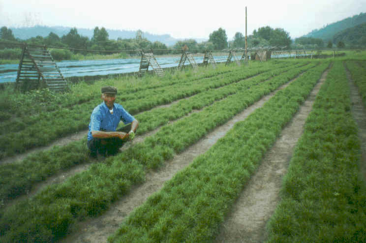 Forstbaumschule Bugant, Vorarbeiter Munchow zwischen den jungen Kiefernpflanzen